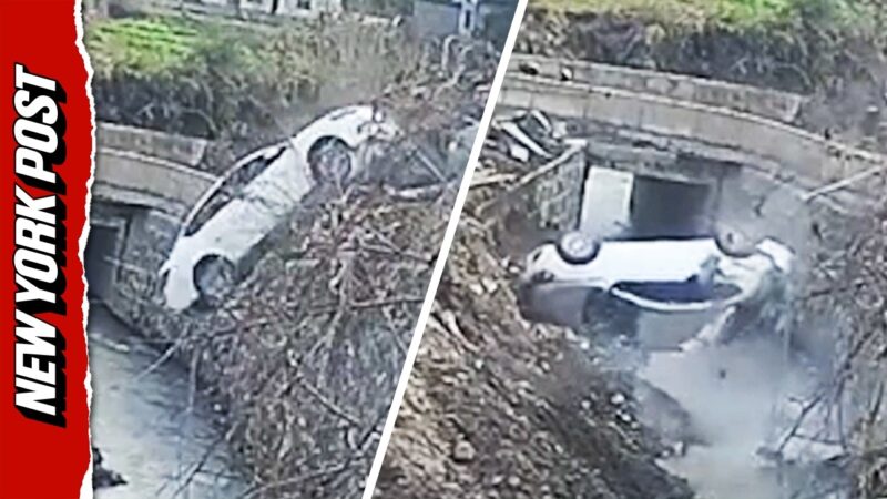 工事現場の横の川に車が後ろ向きに飛び込んできた!!