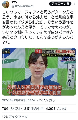 【速報】パさん「小野田紀美はハーフのくせに賛同しない。こいつは昔ハーフが原因で虐められたから虐める側に入って安泰を選んだレイシスト」